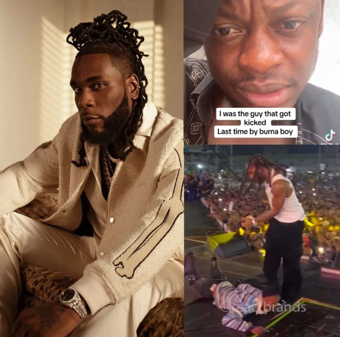 The man who was recently kicked by Nigerian music star Burna Boy during a performance has come forward to speak about the incident, offering his perspective on what happened. In a heartfelt statement, he clarified that his intentions were never malicious and that he simply wanted to express his admiration for the Grammy-winning artist. “I just wanted Burna Boy to embrace me as a fan,” he said, explaining that his actions were driven by excitement and admiration, not any desire to cause harm or disrespect.